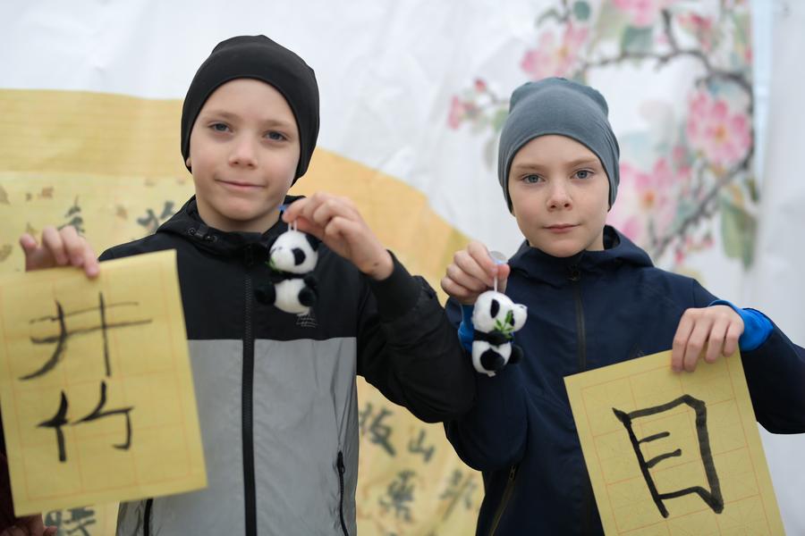 Boys show their Chinese calligraphy works at the 2025 International Chinese Language Day event in Almaty, Kazakhstan, April 19, 2025. (Xinhua/Li Renzi)