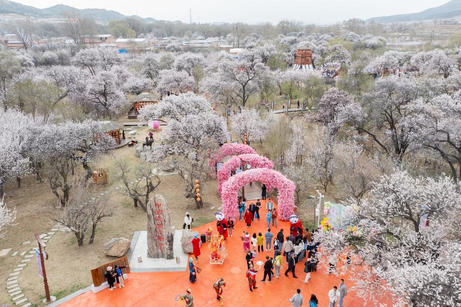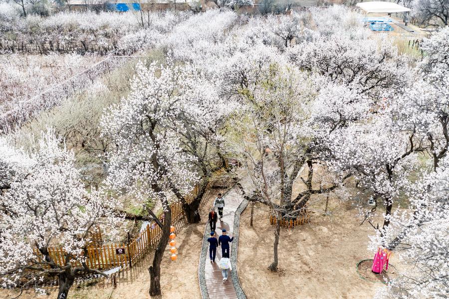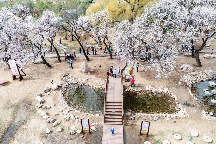 An aerial drone photo shows tourists viewing apricot flowers in Hohhot, north China's Inner Mongolia Autonomous Region, April 20, 2025. (Xinhua/Ma Jinrui)