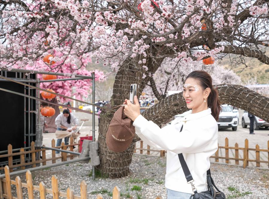 A tourist takes a photo in front of an apricot tree in Hohhot, north China's Inner Mongolia Autonomous Region, April 20, 2025. (Xinhua/Ma Jinrui)