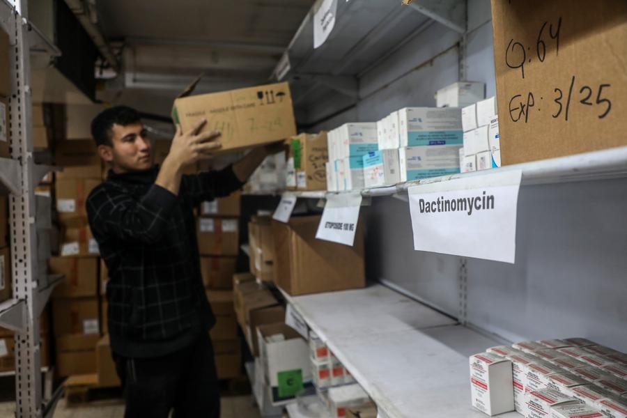 A worker sorts medications at a warehouse of Gaza-based health authorities in Gaza City, on April 17, 2025. (Photo by Rizek Abdeljawad/Xinhua)