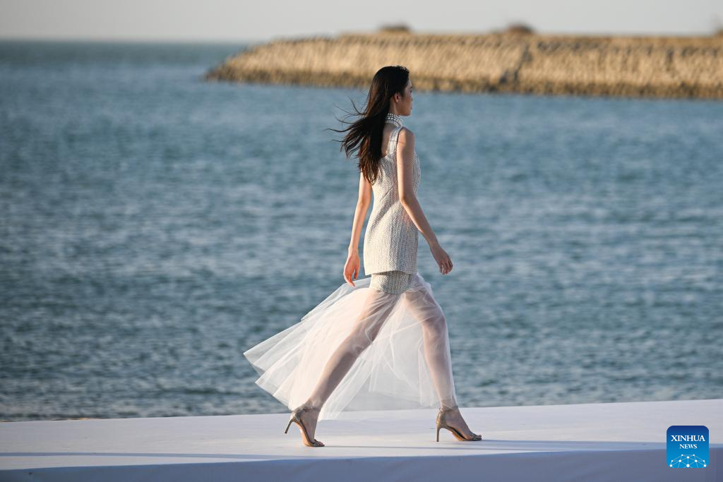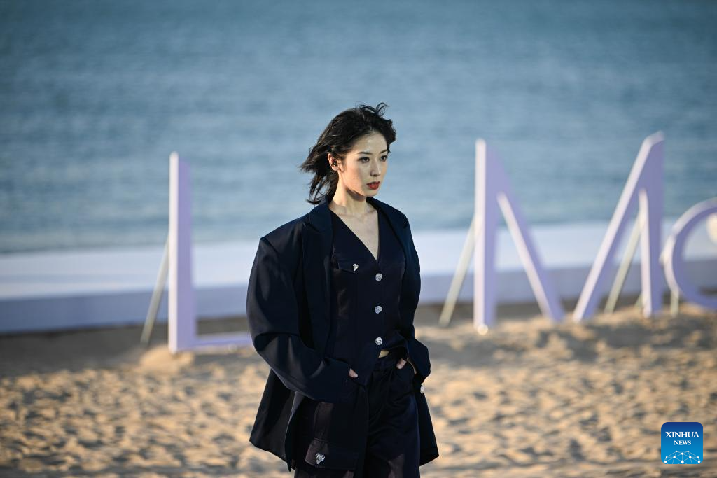 A model presents a fashion design of "La Mofiel" during a seaside show of the 5th China International Consumer Products Expo (CICPE) in Haikou, south China's Hainan Province, April 16, 2025. The 2025 China International Consumer Products Expo (CICPE) fashion show, a side event of the 5th CICPE, staged its closing show here Friday evening.