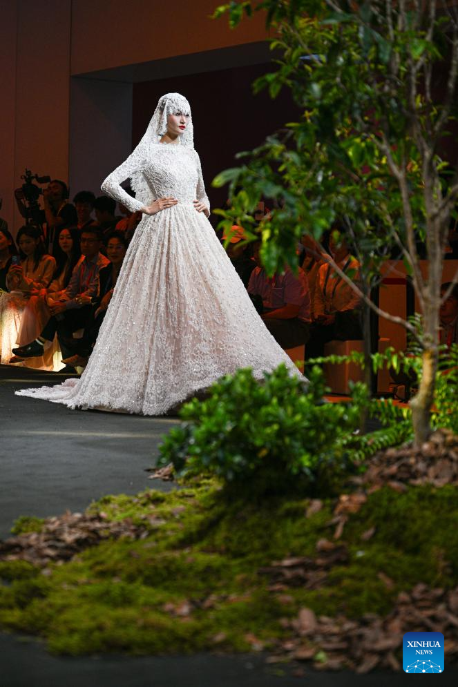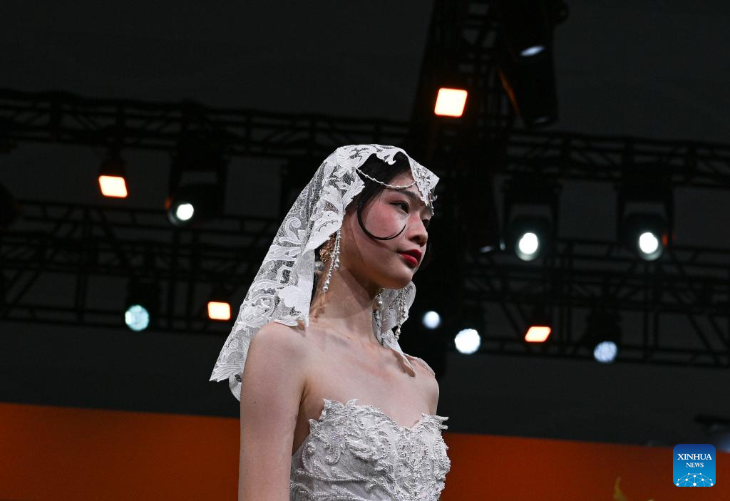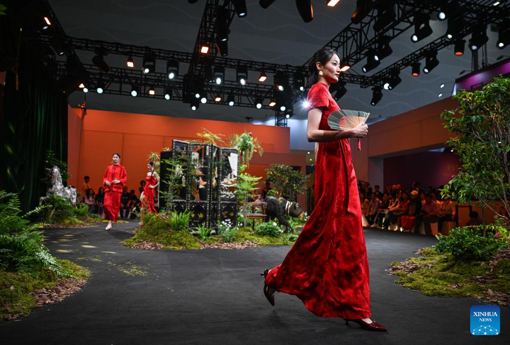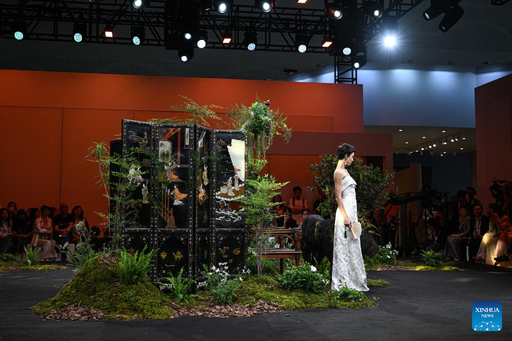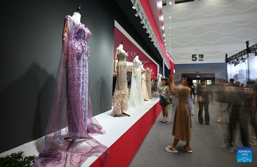 This photo taken on April 18, 2025 shows fashion designs displayed during the 5th China International Consumer Products Expo (CICPE) in Haikou, south China's Hainan Province, The 2025 China International Consumer Products Expo (CICPE) fashion show, a side event of the 5th CICPE, staged its closing show here Friday evening.
