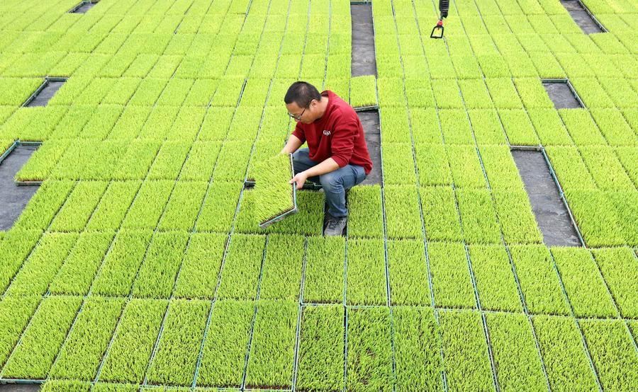 A worker checks the growth of paddy rice seedlings at a smart seedling cultivation factory in Dongheng Village, Huzhou City of east China's Zhejiang Province, March 14, 2025. (Photo by Xie Shangguo/Xinhua)