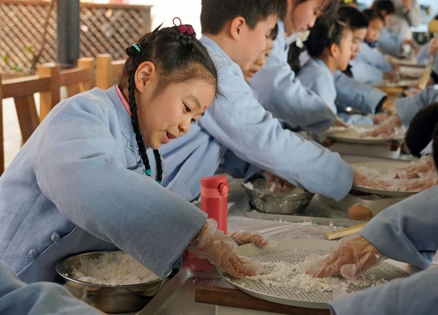 Children learn to make Zhuang Rice Cake during an experience event in Liantang Town of Qingpu District in Shanghai, east China, Jan. 13, 2024. (Xinhua/Liu Ying)
