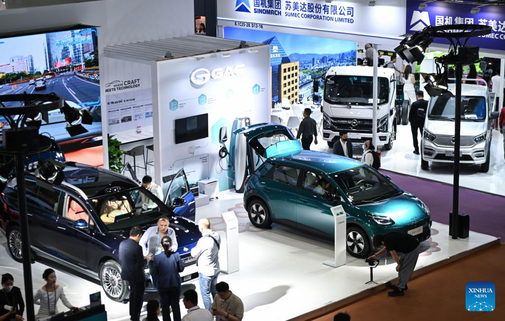 This photo taken on April 18, 2025 shows the exhibition zone of new energy vehicles during the 137th edition of the China Import and Export Fair in Guangzhou, south China's Guangdong Province. The first phase of the 137th edition of the China Import and Export Fair, also known as the Canton Fair, concluded here on Saturday. By April 19, a total of 148,585 overseas buyers from 216 countries and regions had attended the event, marking a 20.2 percent increase compared to the same period last year. (Xinhua/Deng Hua)
