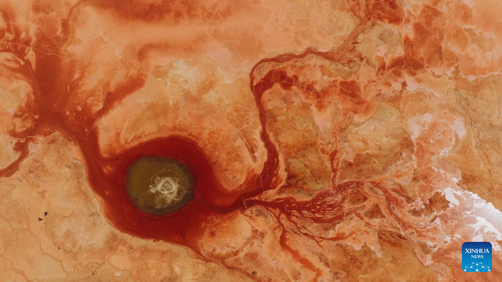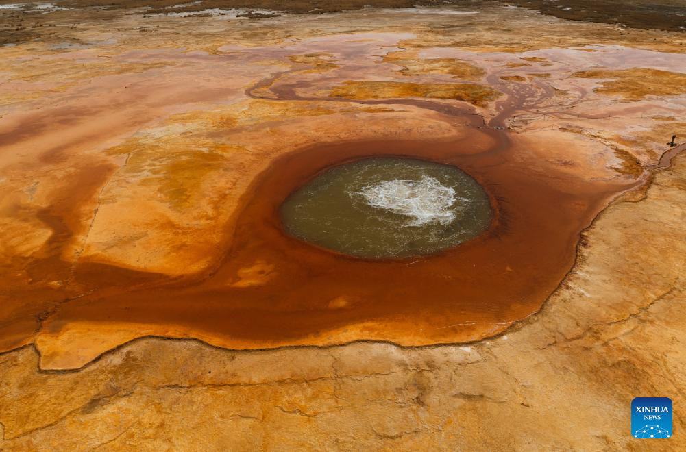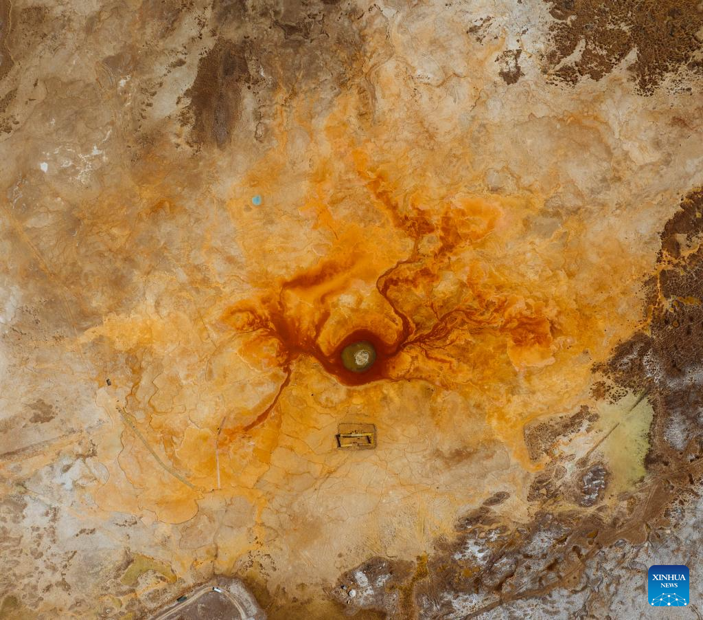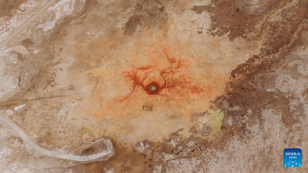 An aerial drone photo taken on April 19, 2025 shows the Aiken Spring in Mangya, Haixi Mongolian and Tibetan Autonomous Prefecture of northwest China's Qinghai Province. Located in northwest China's Qinghai Province, Aiken Spring is dubbed the "Eye of the Earth." This rare geological wonder forms a unique pupil shape from above, with spring water and surrounding deep red sediments resembling an eye embedded in the land. (Xinhua/Wang Bo)