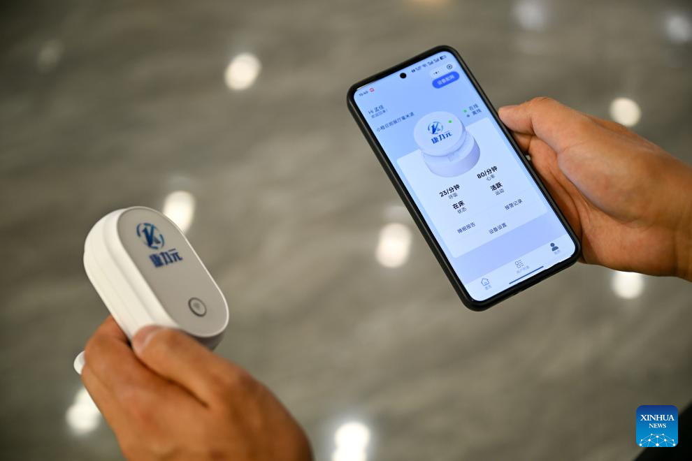 A staff member shows a millimeter-wave sign monitor which can be checked on cellphone at Tianjin Xiaocheng Group Co., Ltd in Tianjin, north China, April 18, 2025. In recent years, a batch of digital technology-based companies have fostered their development at a digital economy industrial park in Tianjin, injecting impetus into the high-quality development of local economy. (Xinhua/Sun Fanyue)