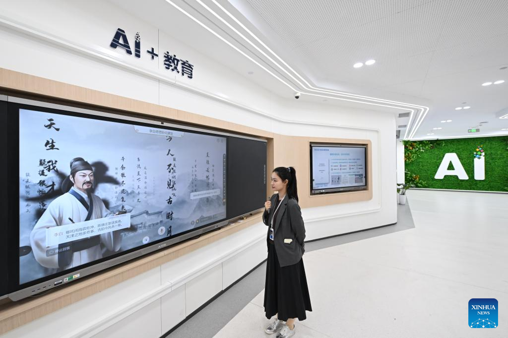 A staff member shows AI products applied for education field at Tianjin branch of iFLYTEK in Tianjin, north China, April 18, 2025. In recent years, a batch of digital technology-based companies have fostered their development at a digital economy industrial park in Tianjin, injecting impetus into the high-quality development of local economy. (Xinhua/Sun Fanyue)