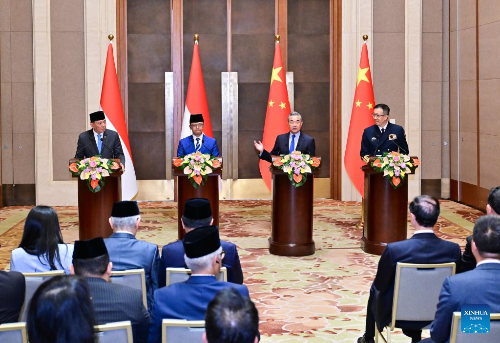 Member of the Political Bureau of the Communist Party of China Central Committee and Foreign Minister Wang Yi speaks at a press conference, jointly attended by Chinese Defense Minister Dong Jun, Indonesia's Foreign Minister Sugiono and Defense Minister Sjafrie Sjamsoeddin, after the First Ministerial Meeting of China-Indonesia Joint Foreign and Defense Ministerial Dialogue in Beijing, capital of China, April 21, 2025. They chaired the meeting together in Beijing on Monday. (Xinhua/Yue Yuewei)