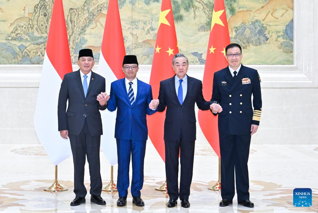 Member of the Political Bureau of the Communist Party of China Central Committee and Foreign Minister Wang Yi and Defense Minister Dong Jun chair the First Ministerial Meeting of China-Indonesia Joint Foreign and Defense Ministerial Dialogue, together with Indonesia's Foreign Minister Sugiono and Defense Minister Sjafrie Sjamsoeddin, in Beijing, capital of China, April 21, 2025. (Xinhua/Yue Yuewei)