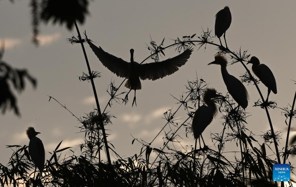 Egrets perch on the top of bamboo in Zhuxi Township, Dazu District of southwest China's Chongqing Municipality, April 20, 2025. This spring more than a thousand egrets have come to inhabit along the Laixi River in Zhuxi Township, a result of continuous ecological protection efforts of local government. The egrets, a manifestation of local ecological restoration, have added vigor and vitality here as well. (Xinhua/Chen Cheng)