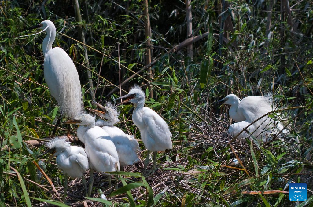 Egret nestlings wait for their parents to feed them in Zhuxi Township, Dazu District of southwest China's Chongqing Municipality, April 20, 2025. This spring more than a thousand egrets have come to inhabit along the Laixi River in Zhuxi Township, a result of continuous ecological protection efforts of local government. The egrets, a manifestation of local ecological restoration, have added vigor and vitality here as well. (Xinhua/Chen Cheng)