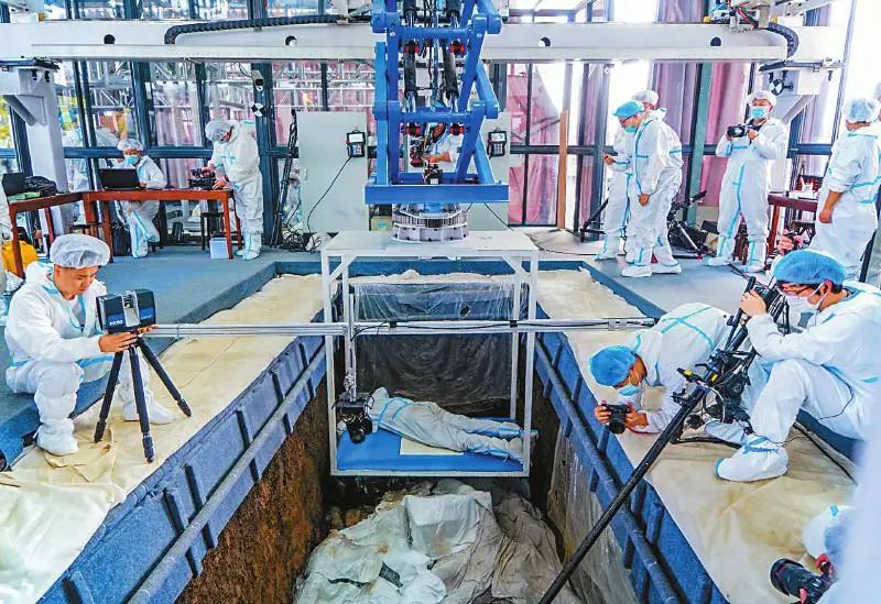 Archaeologists wearing protective suits unearth cultural relics in an archaeological module. (Photo from Sichuan Daily)