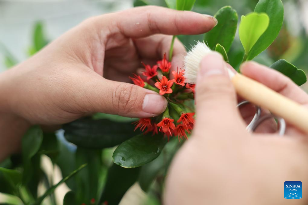 Wang Bingyu, a researcher from Sanya Academy of Forestry, conducts an artificial pollination experiment on a Lumnitzera littorea plant at a greenhouse of the academy in Sanya, south China's Hainan Province, April 10, 2025. (Xinhua/Zhang Liyun)