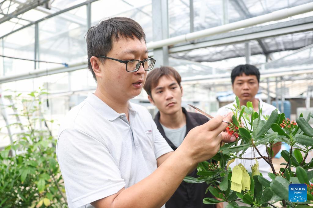 Wang Bingyu (L), a researcher from Sanya Academy of Forestry, conducts an artificial pollination experiment on a Lumnitzera littorea plant at a greenhouse of the academy in Sanya, south China's Hainan Province, April 10, 2025. (Xinhua/Zhang Liyun)