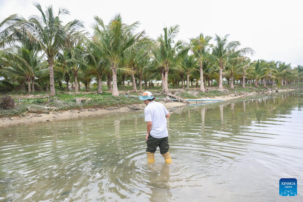 Zeng Dehua, a researcher from Sanya Academy of Forestry, checks Lumnitzera littorea seedlings at the academy in Sanya, south China's Hainan Province, April 9, 2025. (Xinhua/Zhang Liyun)