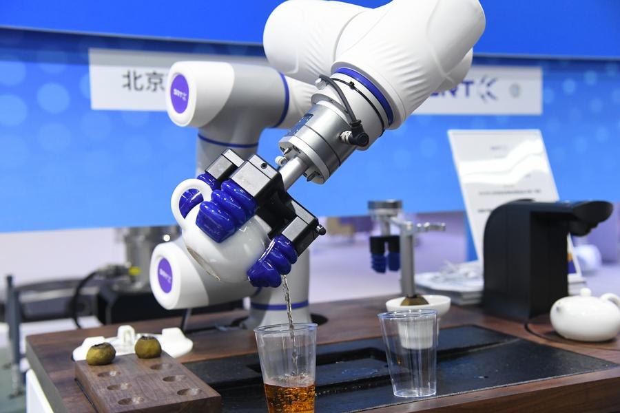 This photo taken on April 28, 2024 shows an intelligent interaction tea art robot platform during a permanent exhibition at the Zhongguancun Exhibition Center in Beijing, capital of China. (Xinhua/Ren Chao)