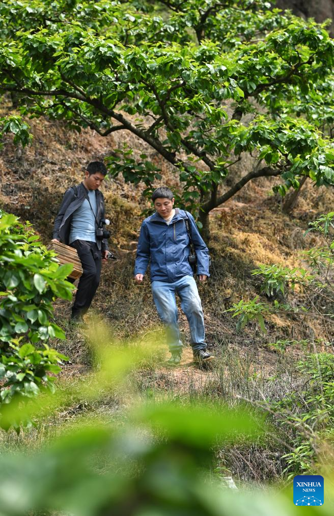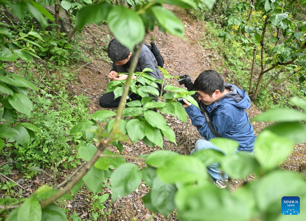 Hu Jun (R) and Luo Yao, researchers at the Chengdu Institute of Biology under Chinese Academy of Sciences (CAS), observe the growth of Euonymus chengduanus in the Longquan Mountains in Chengdu, southwest China's Sichuan Province, April 11, 2025. Chinese researchers have discovered a new species of Celastraceae in Chengdu City of Sichuan Province, and named it Euonymus chengduanus. Their findings have been published in a recent edition of the Ecology and Evolution, according to the Chengdu Institute of Biology under Chinese Academy of Sciences. (Xinhua/Liu Kun)