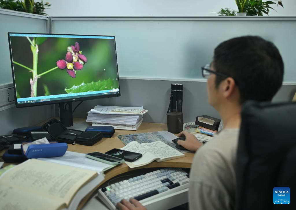 Hu Jun, a researcher at the Chengdu Institute of Biology under Chinese Academy of Sciences (CAS), views a file photo of Euonymus chengduanus in Chengdu, southwest China's Sichuan Province, April 11, 2025. Chinese researchers have discovered a new species of Celastraceae in Chengdu City of Sichuan Province, and named it Euonymus chengduanus. Their findings have been published in a recent edition of the Ecology and Evolution, according to the Chengdu Institute of Biology under Chinese Academy of Sciences. (Xinhua/Liu Kun)