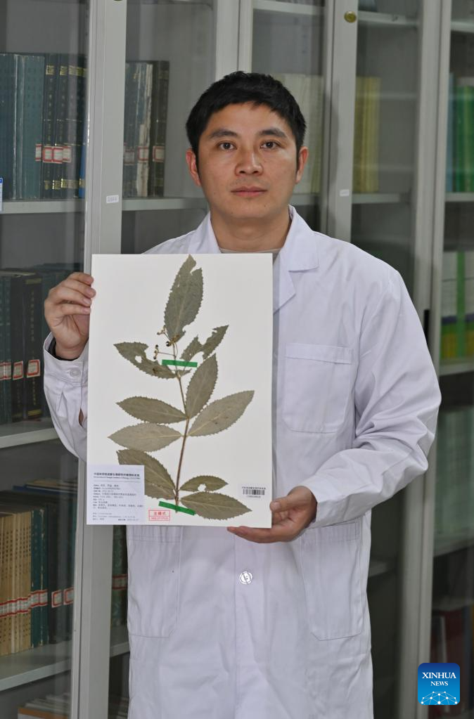 Hu Jun, a researcher at the Chengdu Institute of Biology under Chinese Academy of Sciences (CAS), shows the specimen of Euonymus chengduanus in Chengdu, southwest China's Sichuan Province, April 11, 2025. Chinese researchers have discovered a new species of Celastraceae in Chengdu City of Sichuan Province, and named it Euonymus chengduanus. Their findings have been published in a recent edition of the Ecology and Evolution, according to the Chengdu Institute of Biology under Chinese Academy of Sciences. (Xinhua/Liu Kun)