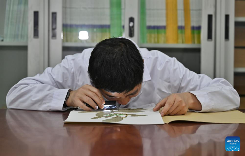 Hu Jun, a researcher at the Chengdu Institute of Biology under Chinese Academy of Sciences (CAS), observes the specimen of Euonymus chengduanus in Chengdu, southwest China's Sichuan Province, April 11, 2025. Chinese researchers have discovered a new species of Celastraceae in Chengdu City of Sichuan Province, and named it Euonymus chengduanus. Their findings have been published in a recent edition of the Ecology and Evolution, according to the Chengdu Institute of Biology under Chinese Academy of Sciences. (Xinhua/Liu Kun)