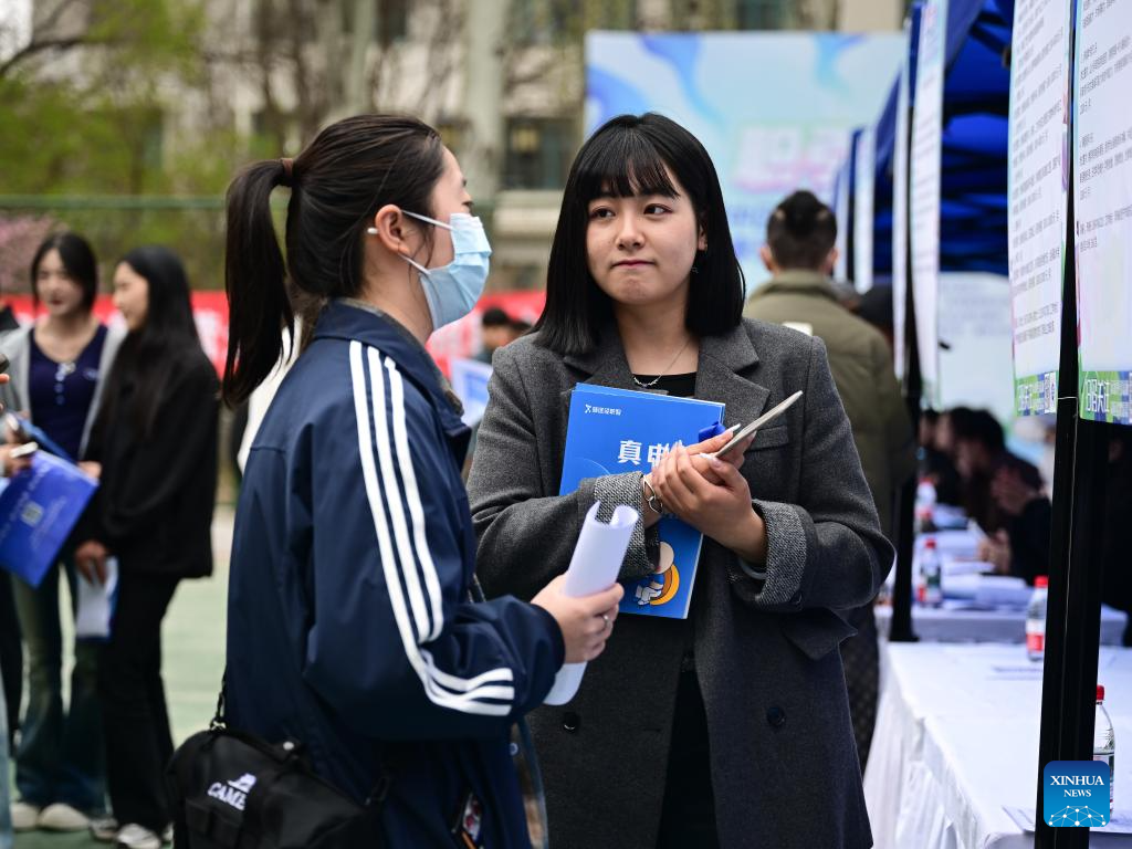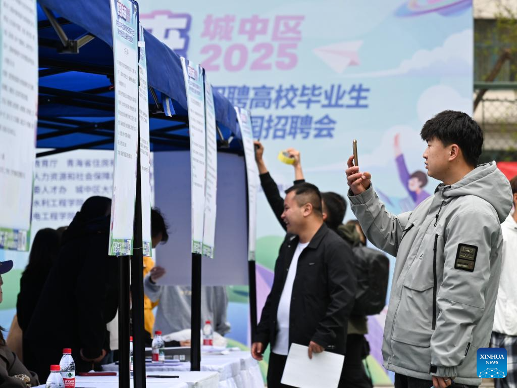 Students attend a campus job fair held at Qinghai College of Architectural Technology in Xining, northwest China's Qinghai Province, April 23, 2025. The job fair was attended by 45 employers who provided more than 1,700 vacancies to job seekers. (Xinhua/Qi Zhiyue)