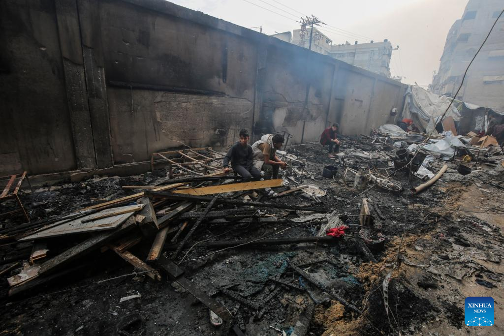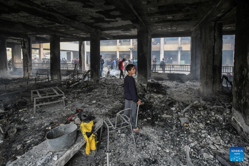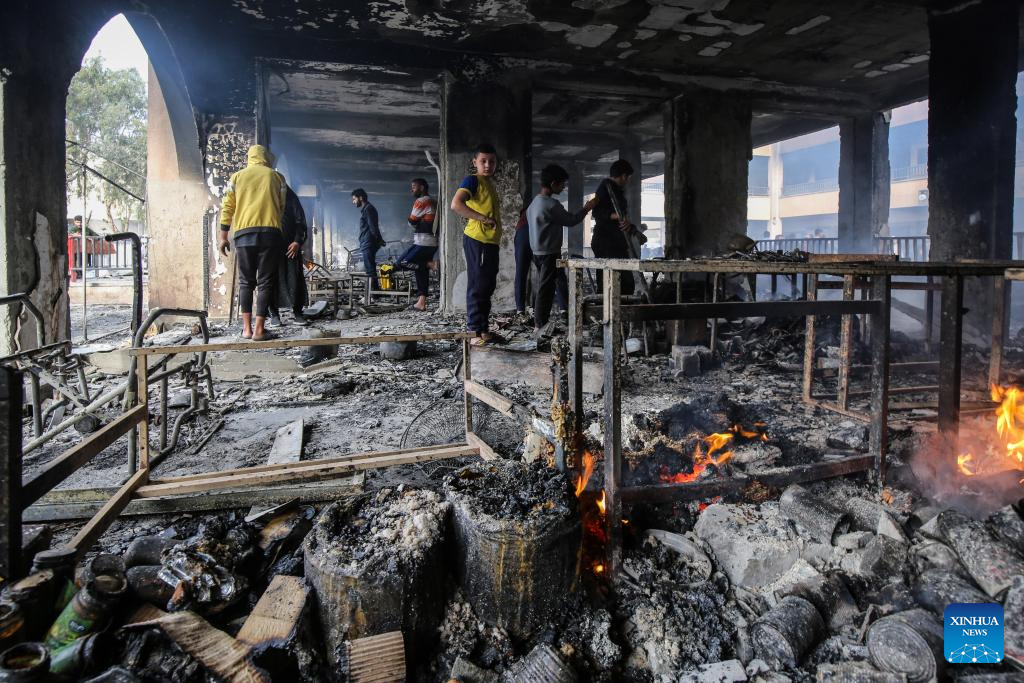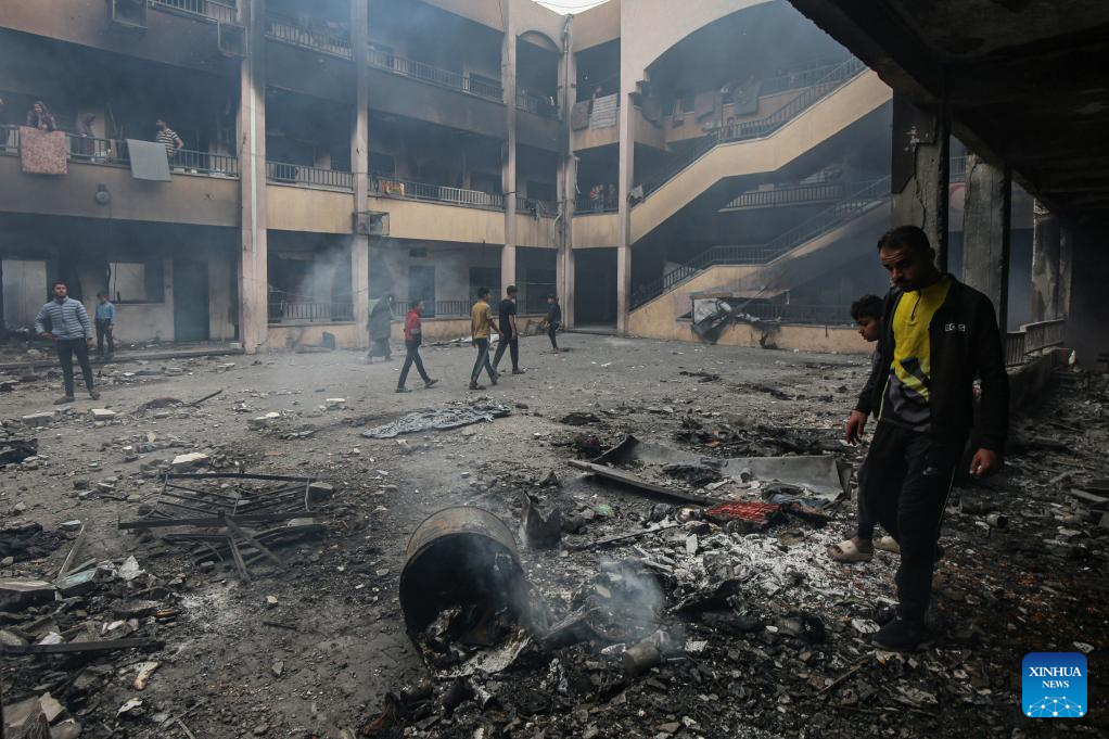 Palestinians are seen at a school after an Israeli airstrike in Gaza City, on April 23, 2025. Israel's Shin Bet domestic security agency and the military said on Wednesday that a deadly overnight airstrike targeting a school sheltering displaced families in northern Gaza was aimed at militants. Gaza's health authorities said the strike killed at least 10 people and caused fires in tents and classrooms at the school. (Photo by Rizek Abdeljawad/Xinhua)