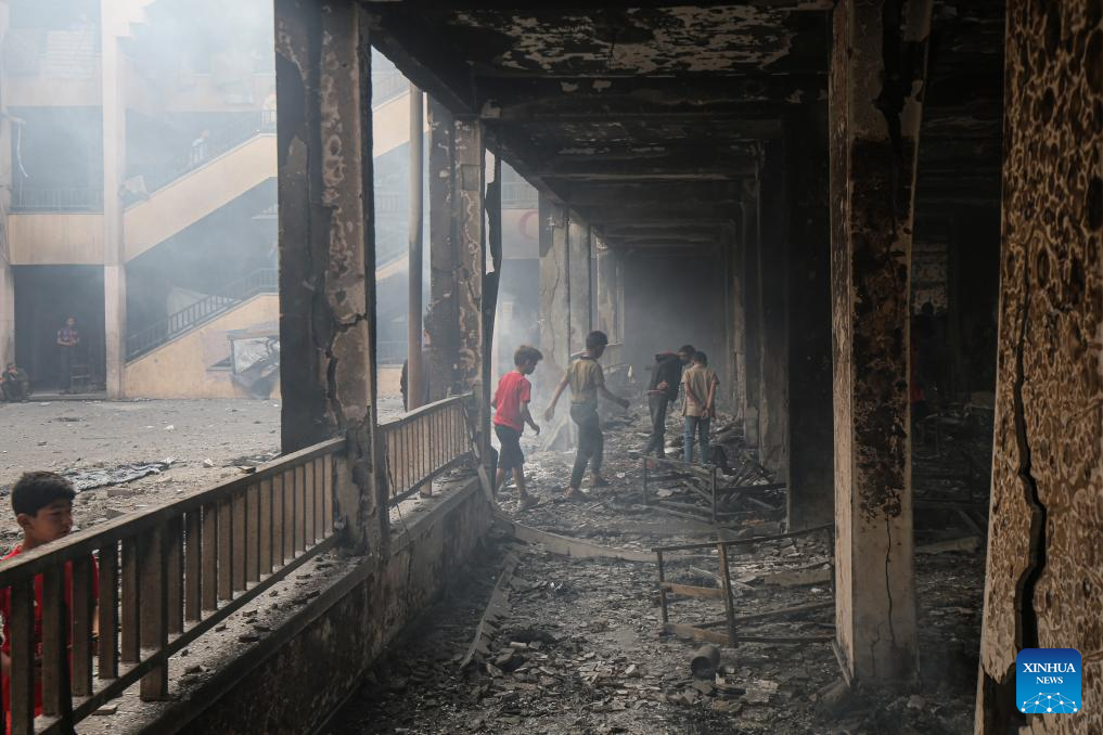 Palestinian children are seen at a school after an Israeli airstrike in Gaza City, on April 23, 2025. Israel's Shin Bet domestic security agency and the military said on Wednesday that a deadly overnight airstrike targeting a school sheltering displaced families in northern Gaza was aimed at militants. Gaza's health authorities said the strike killed at least 10 people and caused fires in tents and classrooms at the school. (Photo by Rizek Abdeljawad/Xinhua)