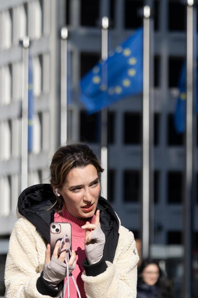 A woman talks through an iPhone at the Berlaymont building, headquarters of the European Commission, in Brussels, Belgium, on March 4, 2024. (Xinhua/Meng Dingbo)