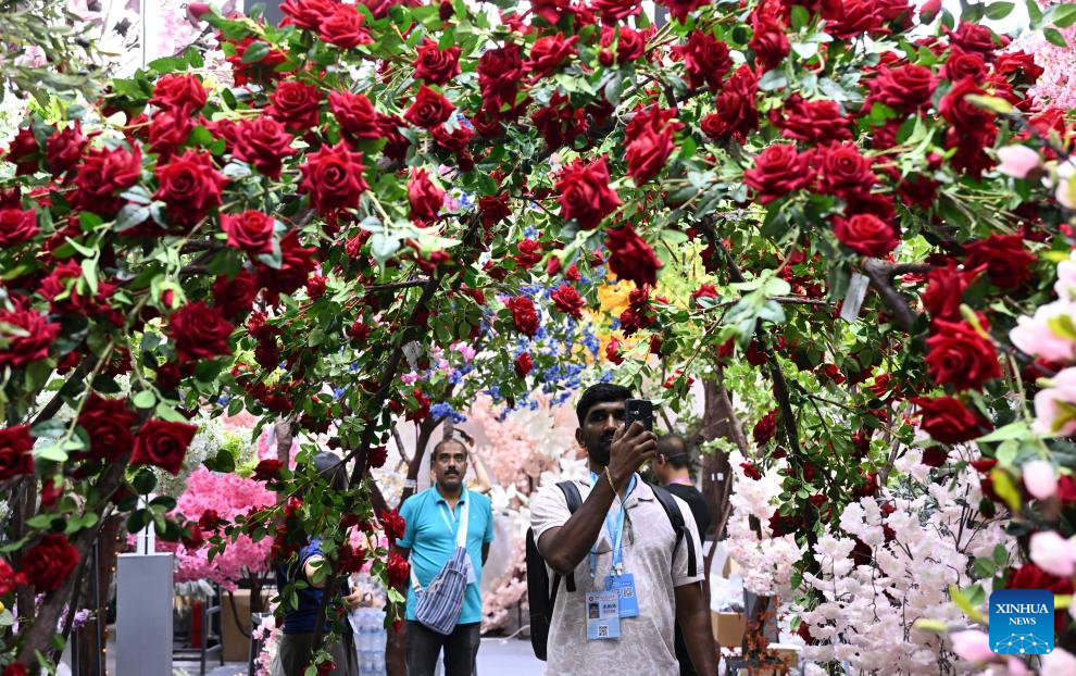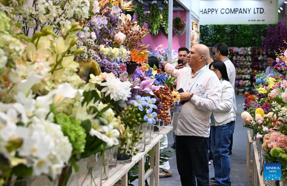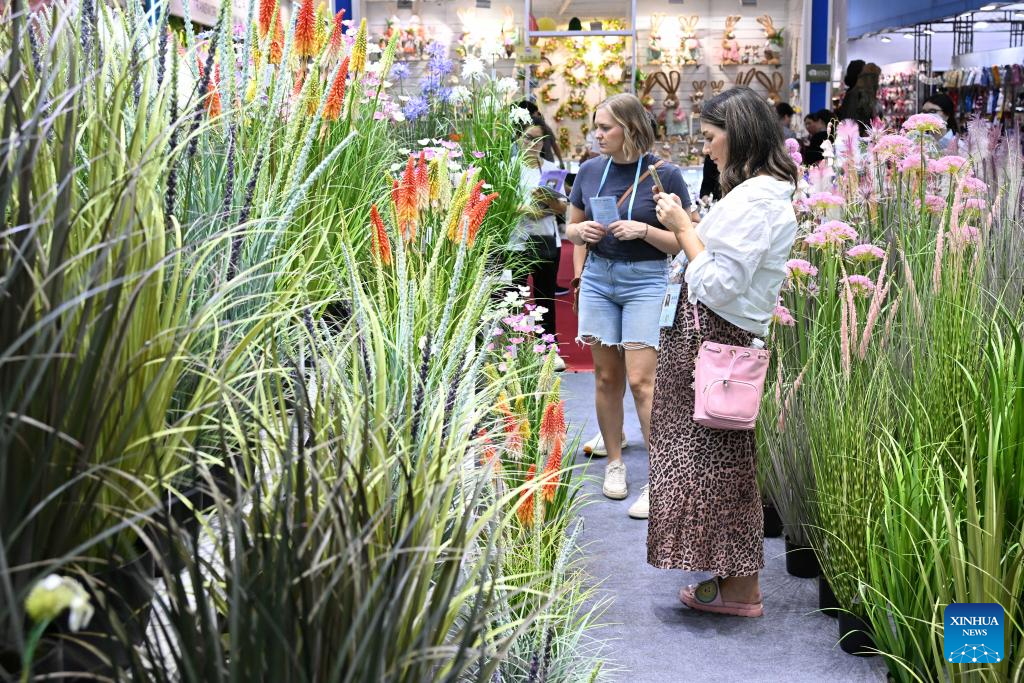 Overseas buyers view artificial flowers during the 137th China Import and Export Fair in Guangzhou, south China's Guangdong Province, April 23, 2025. The second phase of the 137th China Import and Export Fair, also known as Canton Fair, focusing on quality home furnishings, opened on Wednesday with more than 10,000 exhibiting companies. (Xinhua/Deng Hua)