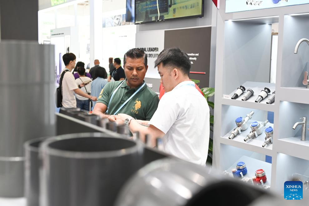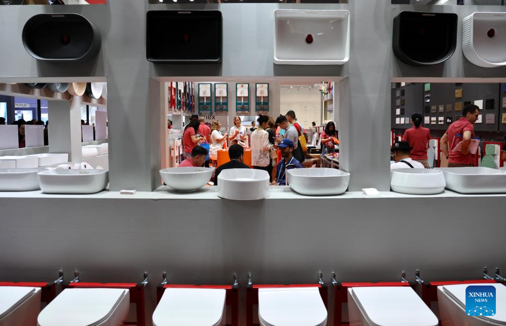 Buyers select bathroom products during the 137th China Import and Export Fair in Guangzhou, south China's Guangdong Province, April 23, 2025. The second phase of the 137th China Import and Export Fair, also known as Canton Fair, focusing on quality home furnishings, opened on Wednesday with more than 10,000 exhibiting companies. (Xinhua/Lu Hanxin)