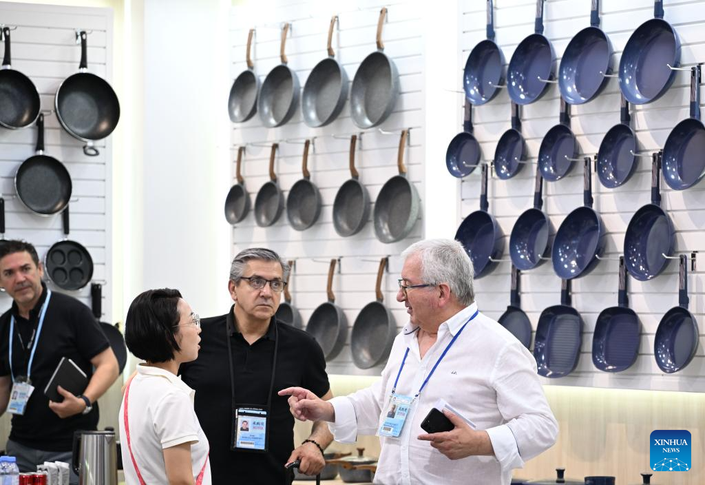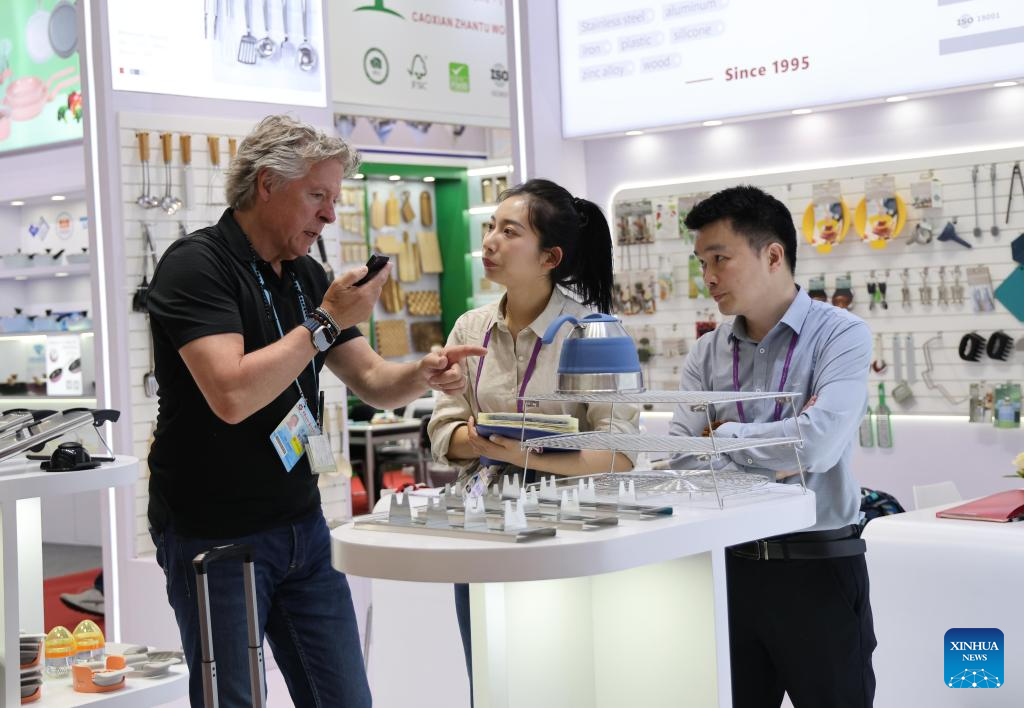 Overseas buyers talk at a kitchenware area during the 137th China Import and Export Fair in Guangzhou, south China's Guangdong Province, April 23, 2025. The second phase of the 137th China Import and Export Fair, also known as Canton Fair, focusing on quality home furnishings, opened on Wednesday with more than 10,000 exhibiting companies. (Xinhua/Deng Hua)