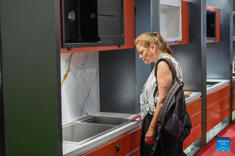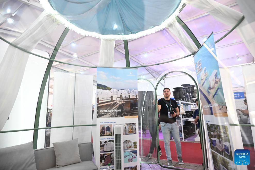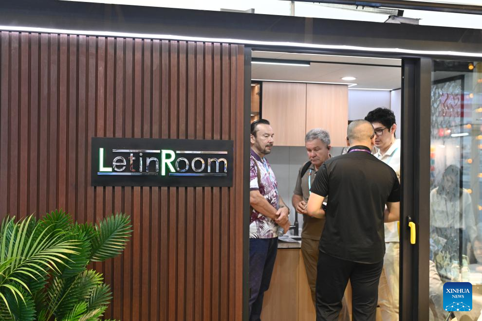 An overseas buyer checks a housing product at an area featuring integrated housing products at the 137th edition of the Canton Fair in Guangzhou, south China's Guangdong Province, April 23, 2025. The second phase of the 137th edition of the Canton Fair themed on quality home furnishings opened on Wednesday. An area featuring integrated housing products was set up for the first time at the event to showcase mobile houses, modular houses, expandable houses and other related products. (Xinhua/Deng Hua)