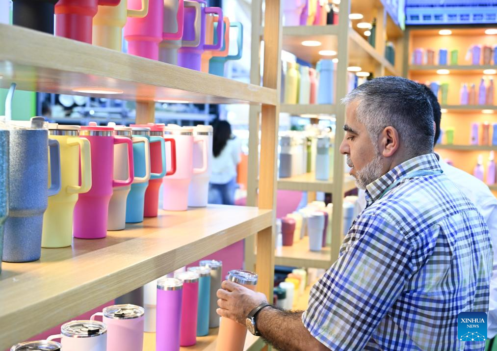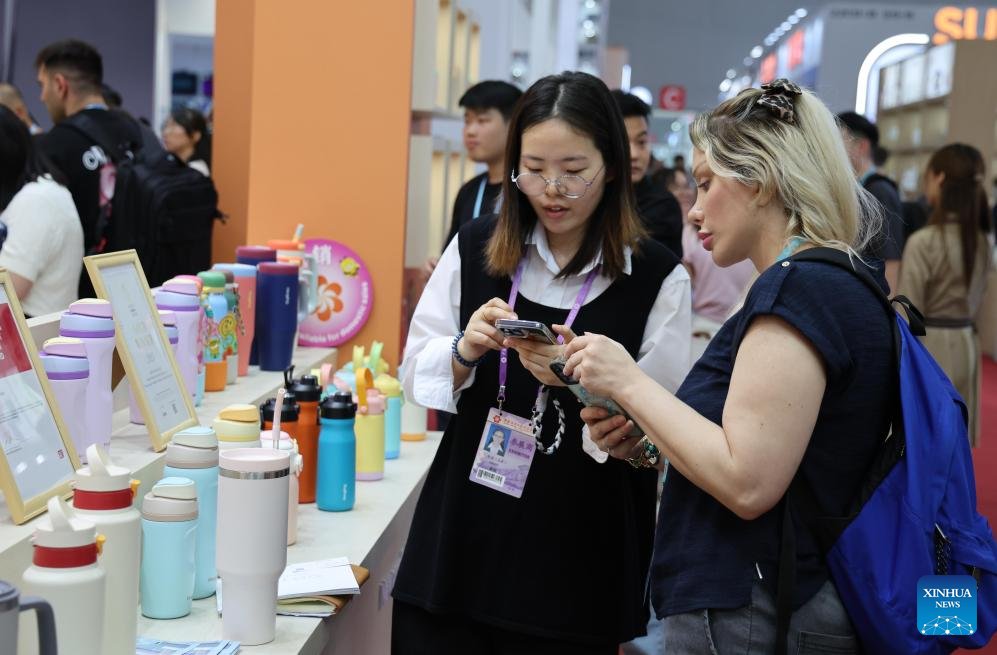An overseas buyer views water bottle products during the 137th China Import and Export Fair in Guangzhou, south China's Guangdong Province, April 23, 2025. The second phase of the 137th China Import and Export Fair, also known as Canton Fair, focusing on quality home furnishings, opened on Wednesday with more than 10,000 exhibiting companies. (Xinhua/Deng Hua)