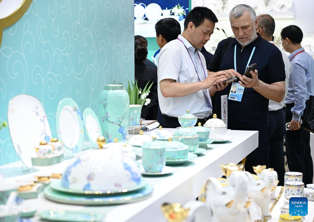 An overseas buyer visits a porcelain area of the 137th China Import and Export Fair in Guangzhou, south China's Guangdong Province, April 23, 2025. The second phase of the 137th China Import and Export Fair, also known as Canton Fair, focusing on quality home furnishings, opened on Wednesday with more than 10,000 exhibiting companies. (Xinhua/Deng Hua)