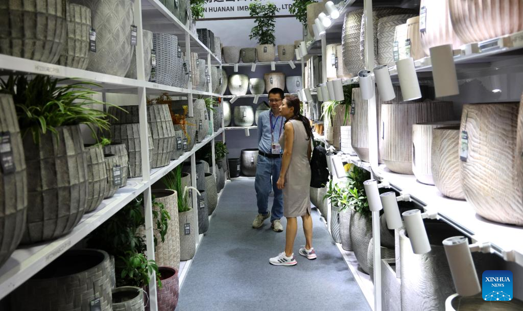 A buyer selects horticultural products during the 137th China Import and Export Fair in Guangzhou, south China's Guangdong Province, April 23, 2025. The second phase of the 137th China Import and Export Fair, also known as Canton Fair, focusing on quality home furnishings, opened on Wednesday with more than 10,000 exhibiting companies. (Xinhua/Lu Hanxin)