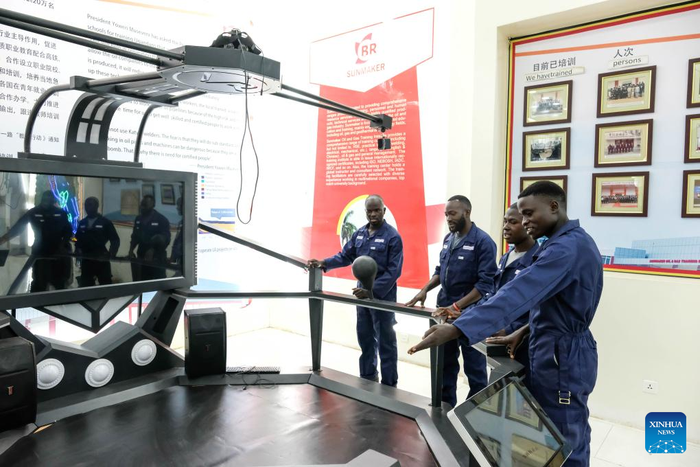 Trainees look at a machine during the opening ceremony of SINOPEC Uganda Subsidiary's localized employee skills training program at the Sunmaker Oil and Gas Training Institute in Kampala, Uganda, on April 23, 2025. SINOPEC, the Chinese firm contracted to build Uganda's Central Processing Facility (CPF), began training more than 800 Ugandans on Wednesday as part of efforts to develop a skilled local workforce for the country's oil sector. (Photo by Hajarah Nalwadda/Xinhua)