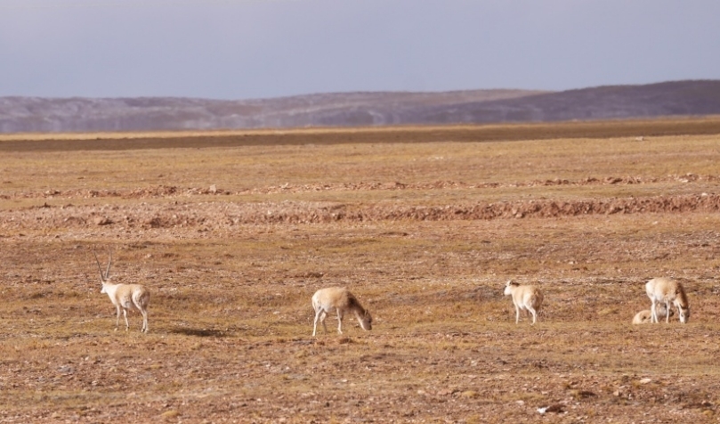 Tibetan antelopes forage in Hoh Xil in northwest China's Qinghai province. (Photo by Gan Haiqiong/People's Daily Online)