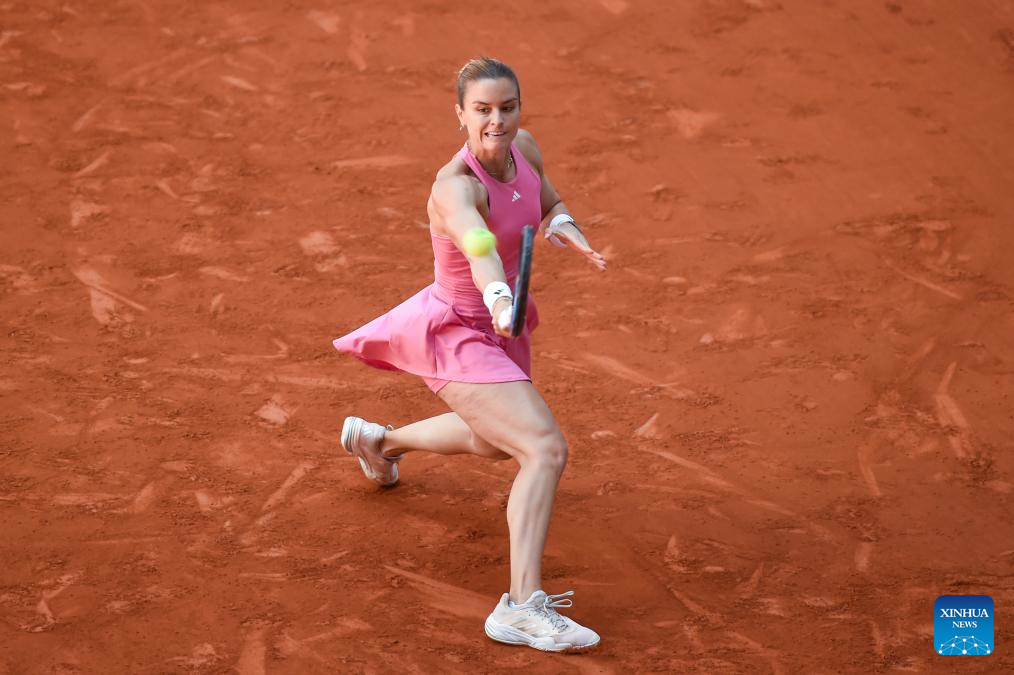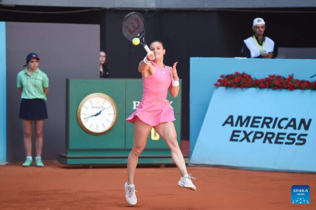 Maria Sakkari of Greece hits a return during the Round of 128 match between Maria Sakkari of Greece and Wang Xinyu of China at the Mutua Madrid Open tennis tournament in Madrid, Spain, on April 23, 2025. (Photo by Gustavo Valiente/Xinhua)