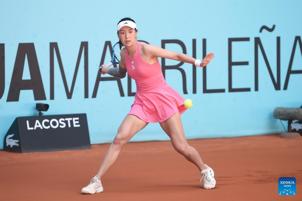 Wang Xinyu of China hits a return during the Round of 128 match between Maria Sakkari of Greece and Wang Xinyu of China at the Mutua Madrid Open tennis tournament in Madrid, Spain, on April 23, 2025. (Photo by Gustavo Valiente/Xinhua)