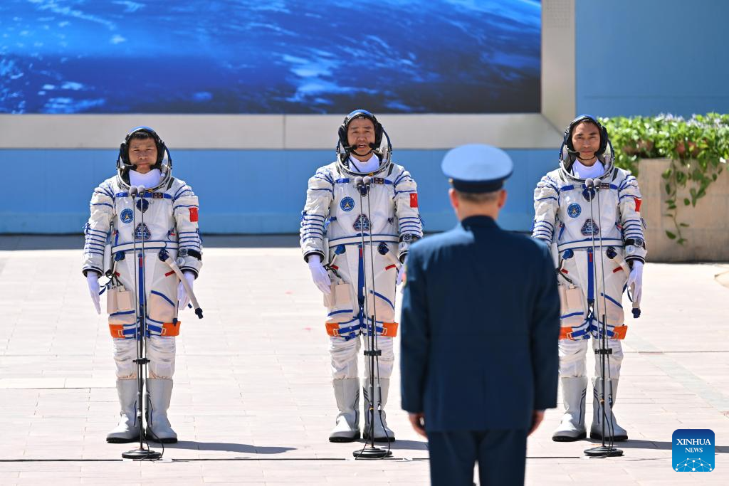 Chinese astronauts Chen Dong (C), Chen Zhongrui (R) and Wang Jie attend a send-off ceremony at the Jiuquan Satellite Launch Center in northwest China on April 24, 2025. A send-off ceremony for the three Chinese astronauts of the Shenzhou-20 crewed space mission was held here on Thursday, according to the China Manned Space Agency. (Xinhua/Li Xin)