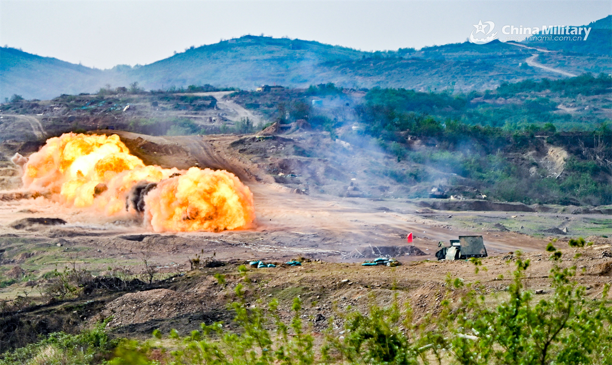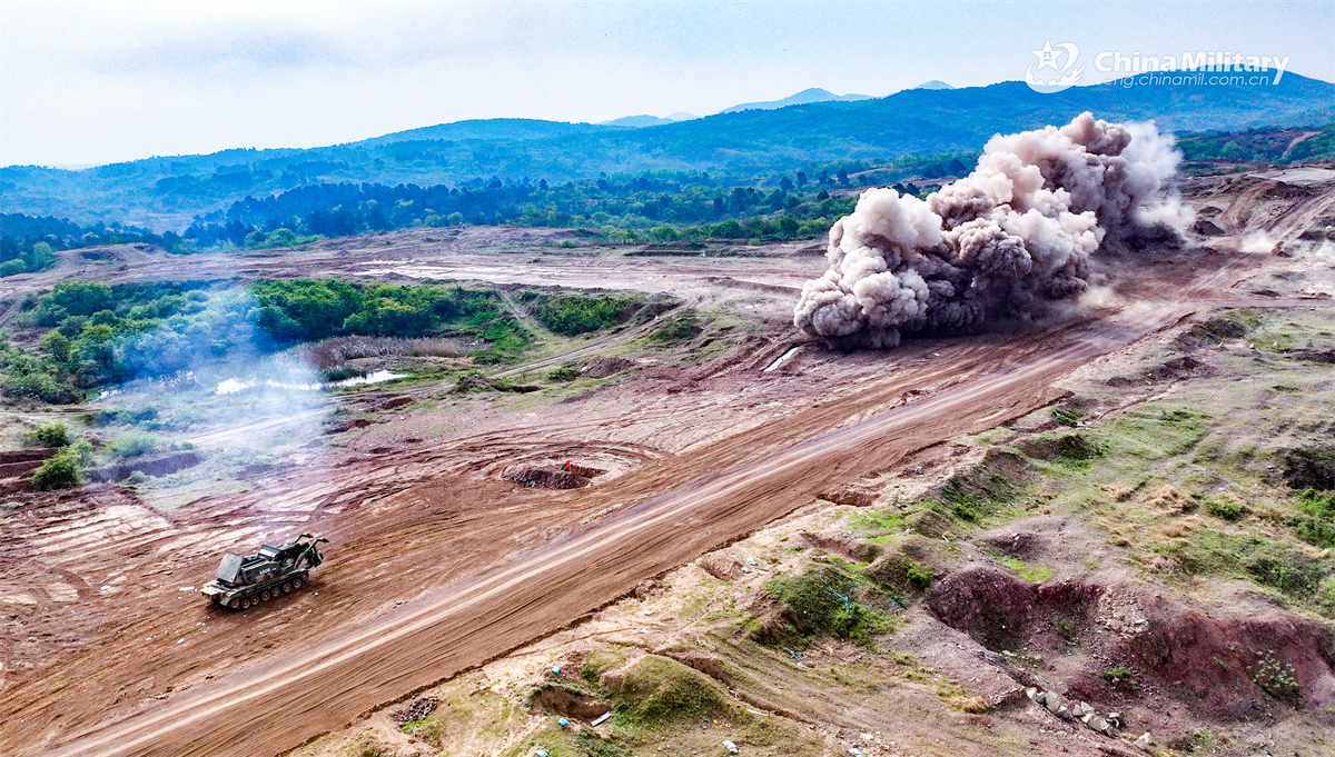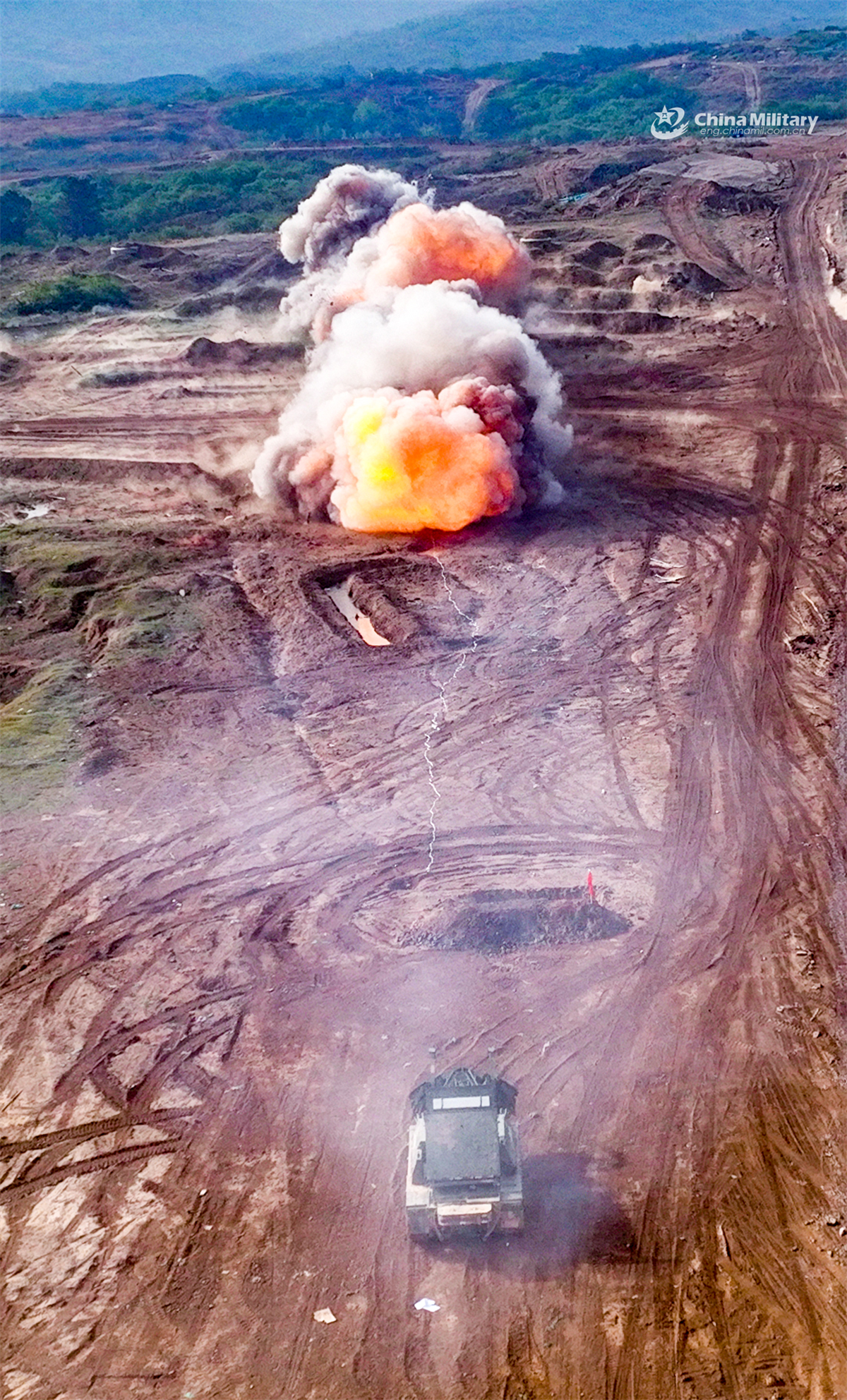 An integrated minesweeping vehicle attached to an engineer element of a combined-arms brigade under the Chinese PLA 71st Group Army detonates explosives during a minesweeping operation on April 9, 2025. (eng.chinamil.com.cn/Photo by Lin Weihong)