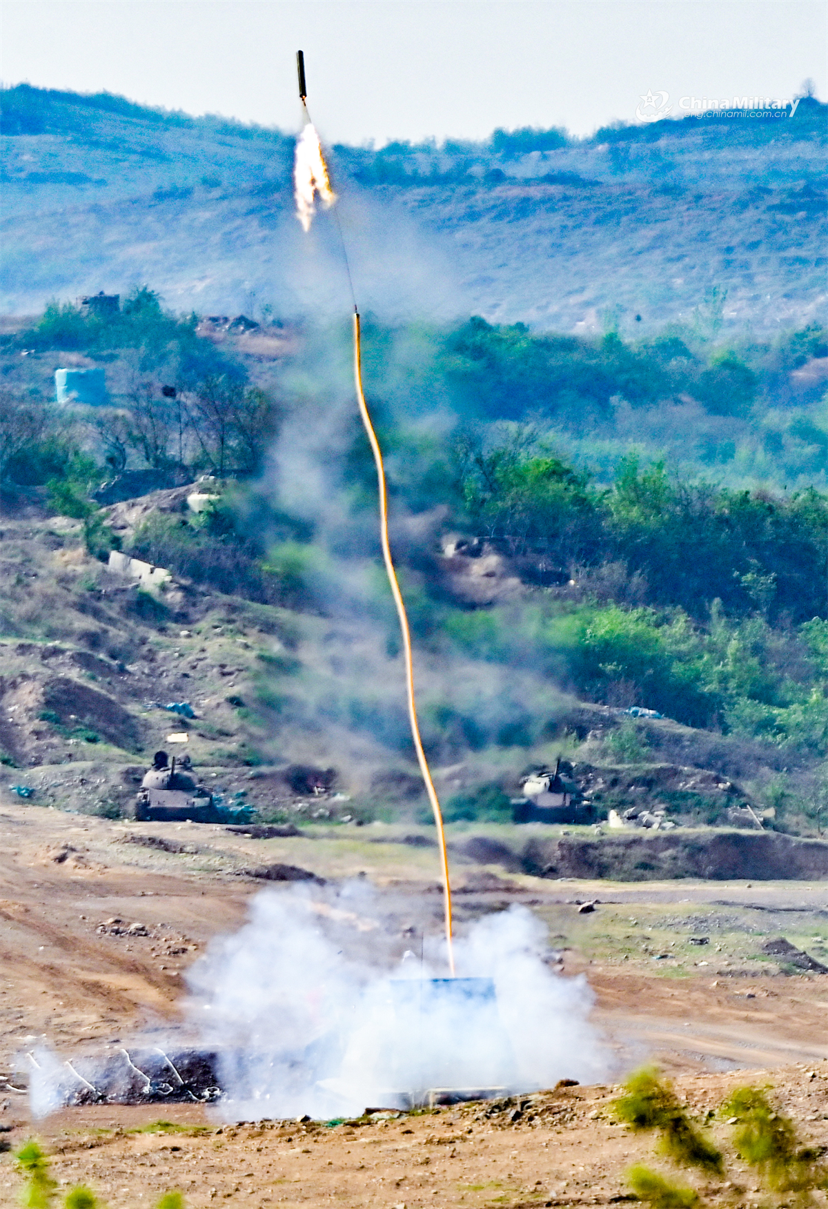 An integrated minesweeping vehicle attached to an engineer element of a combined-arms brigade under the Chinese PLA 71st Group Army fires a wire-guided minesweeping explosive device to the targets during a minesweeping operation on April 9, 2025. (eng.chinamil.com.cn/Photo by Lin Weihong)