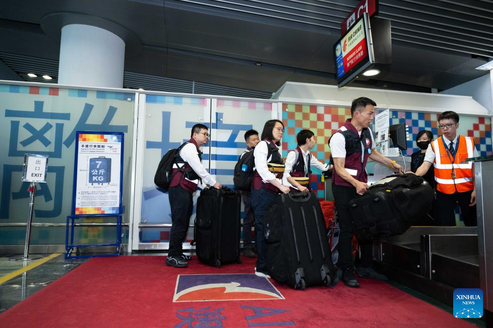 Members of China International Medical Emergency Team (Macao) check in at Macao International Airport in Macao, south China, April 24, 2025. At the invitation of the World Health Organization (WHO), the China International Medical Emergency Team (Macao) departed for Myanmar on Thursday to carry out a 14-day mission focused on post-earthquake emergency medical coordination and technical support. (Xinhua/Cheong Kam Ka)