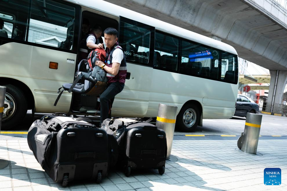 Members of China International Medical Emergency Team (Macao) transport luggage at Macao International Airport in Macao, south China, April 24, 2025. At the invitation of the World Health Organization (WHO), the China International Medical Emergency Team (Macao) departed for Myanmar on Thursday to carry out a 14-day mission focused on post-earthquake emergency medical coordination and technical support. (Xinhua/Cheong Kam Ka)