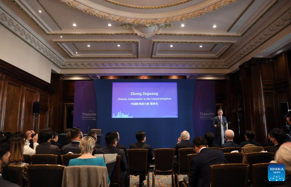 Chinese Ambassador to the United Kingdom (UK) Zheng Zeguang (Rear) delivers a speech at an investment and business promotion event for China's northern port city of Tianjin, held in London, Britain, on April 24, 2025. China's firm opposition and countermeasures to the United States' (U.S.) so-called "reciprocal tariffs" are aimed not only at safeguarding its own national interests, but also at defending the multilateral trading system and upholding international justice, said Chinese Ambassador to the United Kingdom (UK) Zheng Zeguang on Thursday. (Xinhua/Li Ying)
