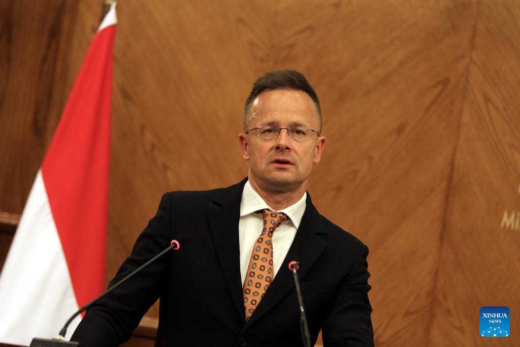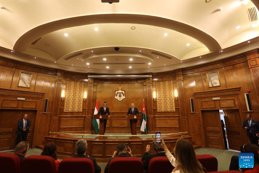 Hungarian Minister of Foreign Affairs and Trade Peter Szijjarto speaks at a joint press conference with Jordanian Foreign Minister Ayman Safadi (not in the picture) in Amman, Jordan, on April 24, 2025. Jordan's Foreign Minister Ayman Safadi on Thursday stressed the necessity of halting the aggression on Gaza, reaching an immediate ceasefire, fully implementing the prisoner exchange agreement, and allowing the entry of humanitarian aid into Gaza. He made the remarks during a meeting in Amman with Hungarian Minister of Foreign Affairs and Trade Peter Szijjarto, according to a statement by the ministry. (Photo by Mohammad Abu Ghosh/Xinhua)