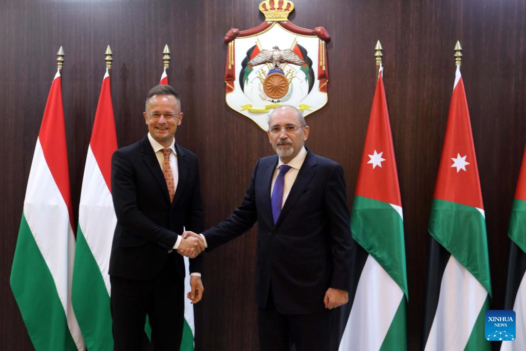 Jordanian Foreign Minister Ayman Safadi (R) shakes hands with Hungarian Minister of Foreign Affairs and Trade Peter Szijjarto during their meeting in Amman, Jordan, on April 24, 2025. Jordan's Foreign Minister Ayman Safadi on Thursday stressed the necessity of halting the aggression on Gaza, reaching an immediate ceasefire, fully implementing the prisoner exchange agreement, and allowing the entry of humanitarian aid into Gaza. He made the remarks during a meeting in Amman with Hungarian Minister of Foreign Affairs and Trade Peter Szijjarto, according to a statement by the ministry. (Photo by Mohammad Abu Ghosh/Xinhua)