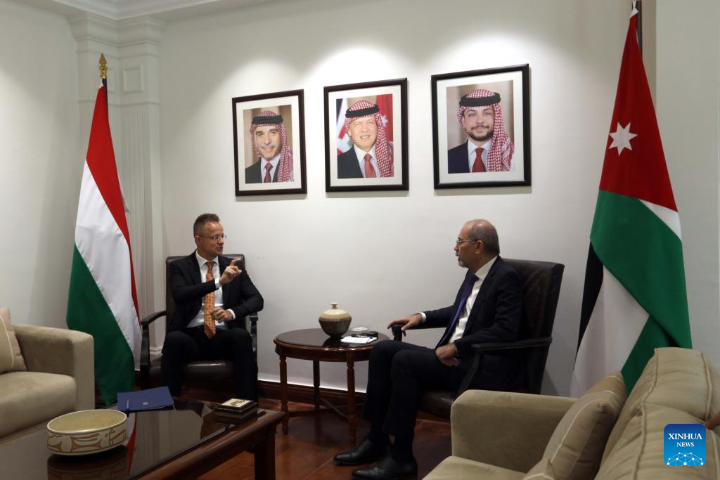 Jordanian Foreign Minister Ayman Safadi (R) meets with Hungarian Minister of Foreign Affairs and Trade Peter Szijjarto in Amman, Jordan, on April 24, 2025. Jordan's Foreign Minister Ayman Safadi on Thursday stressed the necessity of halting the aggression on Gaza, reaching an immediate ceasefire, fully implementing the prisoner exchange agreement, and allowing the entry of humanitarian aid into Gaza. He made the remarks during a meeting in Amman with Hungarian Minister of Foreign Affairs and Trade Peter Szijjarto, according to a statement by the ministry. (Photo by Mohammad Abu Ghosh/Xinhua)