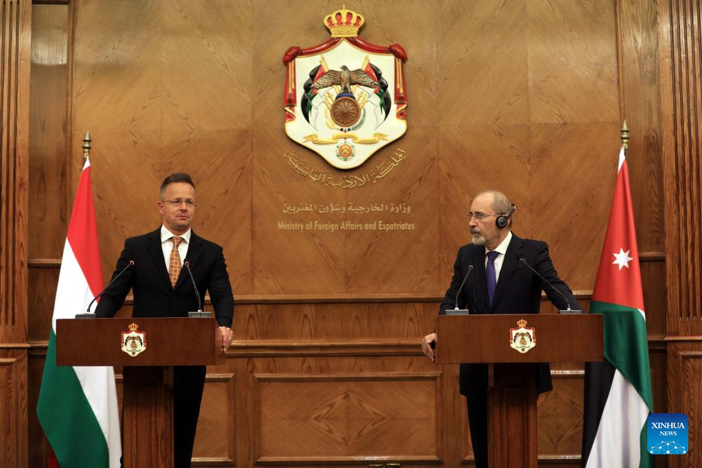 Jordanian Foreign Minister Ayman Safadi (R) and Hungarian Minister of Foreign Affairs and Trade Peter Szijjarto attend a joint press conference in Amman, Jordan, on April 24, 2025. Jordan's Foreign Minister Ayman Safadi on Thursday stressed the necessity of halting the aggression on Gaza, reaching an immediate ceasefire, fully implementing the prisoner exchange agreement, and allowing the entry of humanitarian aid into Gaza. He made the remarks during a meeting in Amman with Hungarian Minister of Foreign Affairs and Trade Peter Szijjarto, according to a statement by the ministry. (Photo by Mohammad Abu Ghosh/Xinhua)